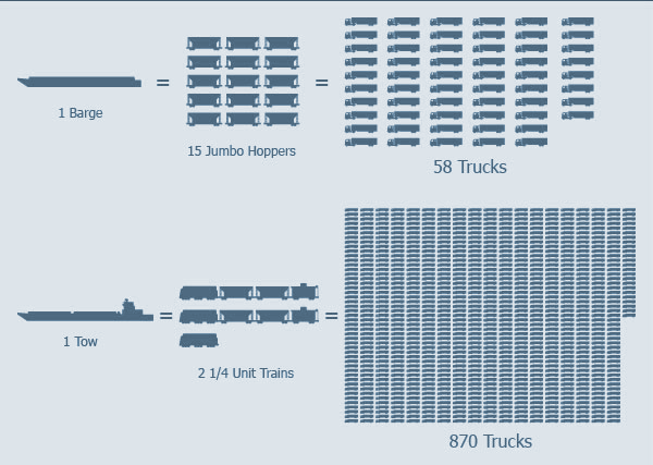 Selecting rail as a mode of transportation a bulk product and putting it in a truck. The comparison below shows that one barge can handle as much as 58 trucks ONE BARGE 1,500 TON 52,500 BUSHELS 453,600 GALLONS ONE BARGE ONE 15-BARGE TOW ... View Document